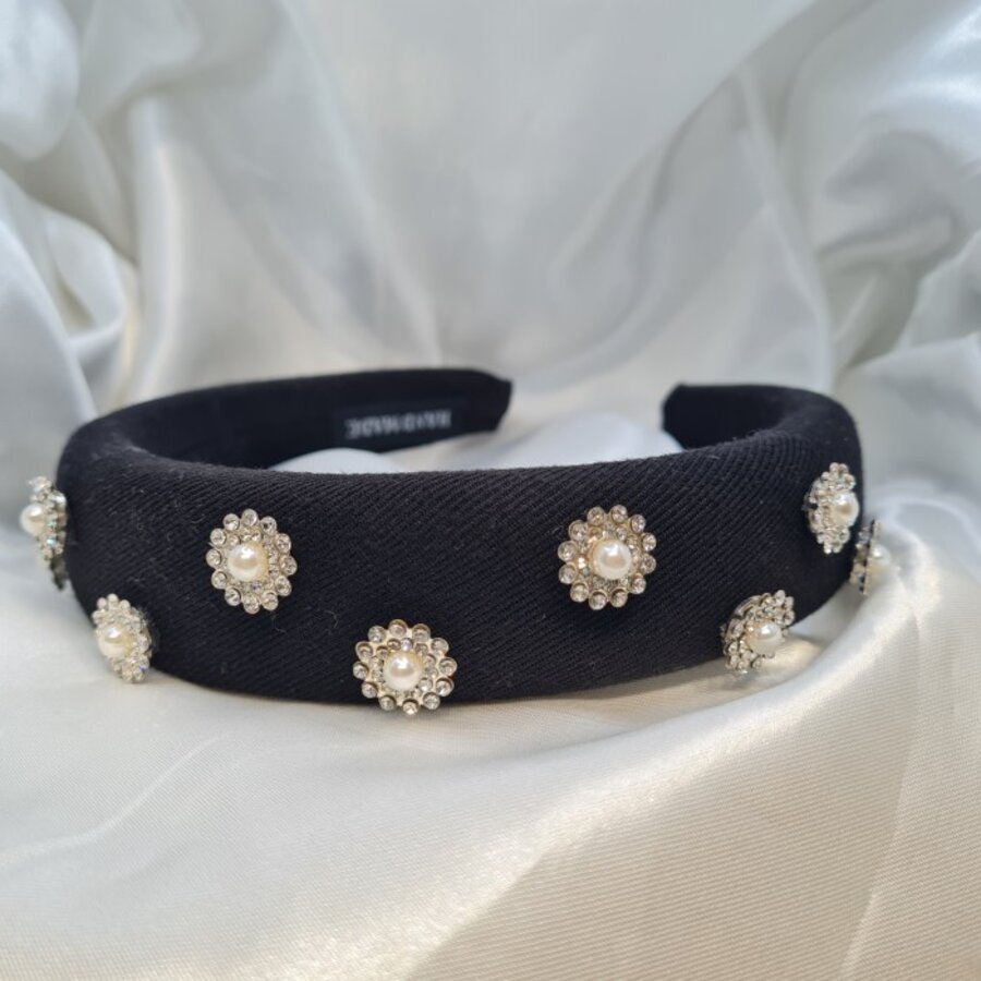 Η μαύρη υφασμάτινη βάση αγκαλιάζει άνετα το κεφάλι, ενώ οι ανάγλυφες διακοσμητικές “ανθίσεις” από περλίτσες και λαμπερά κρυσταλλάκια δημιουργούν ένα φίνο, σοφιστικέ αποτέλεσμα. Είναι το είδος του αξεσουάρ που δίνει αμέσως αέρα προσοχής — χωρίς να χρειάζεται τίποτα παραπάνω.