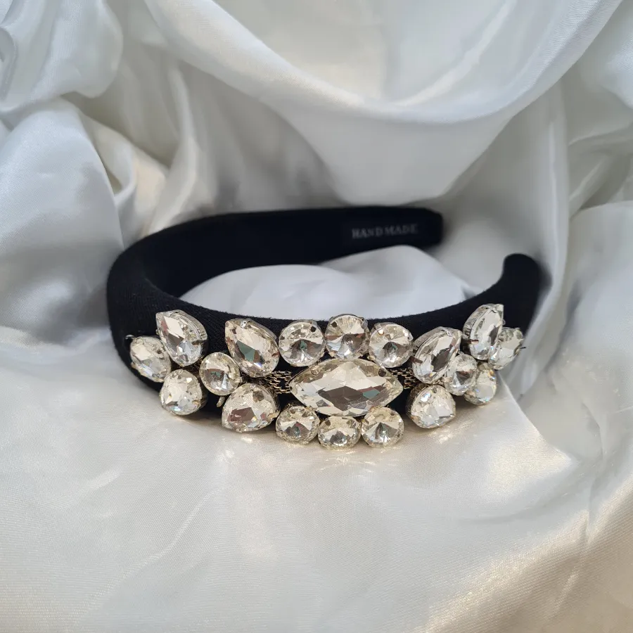 Η μαύρη υφασμάτινη βάση αγκαλιάζει άνετα το κεφάλι, ενώ οι ανάγλυφες διακοσμητικές “ανθίσεις” από περλίτσες και λαμπερά κρυσταλλάκια δημιουργούν ένα φίνο, σοφιστικέ αποτέλεσμα. Είναι το είδος του αξεσουάρ που δίνει αμέσως αέρα προσοχής — χωρίς να χρειάζεται τίποτα παραπάνω.