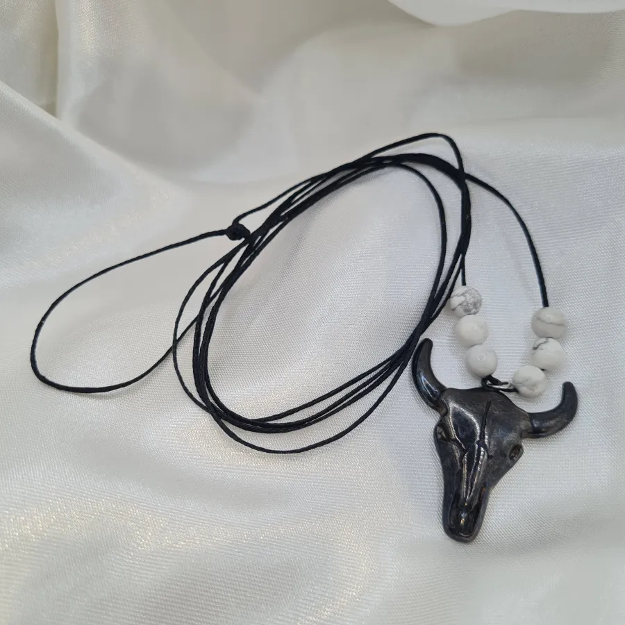 Αν λατρεύεις το διαφορετικό και τη δύναμη του συμβολισμού αυτό είναι για εσένα. Το ανδρικό κολιέ κεφάλι ταύρου σε μαύρο μεταλλικό τόνο, έχει industrial αισθητική και έντονες ανάγλυφες λεπτομέρειες. Το κορδόνι είναι μαύρο και σταθερό, αλλά η διαφορά βρίσκεται στις πέντε λευκές πέτρινες χάντρες τύπου χαολίτη, που “σπάνε” το σκοτεινό αποτέλεσμα δίνοντας ξεχωριστή urban πινελιά και φωτεινό contrast.