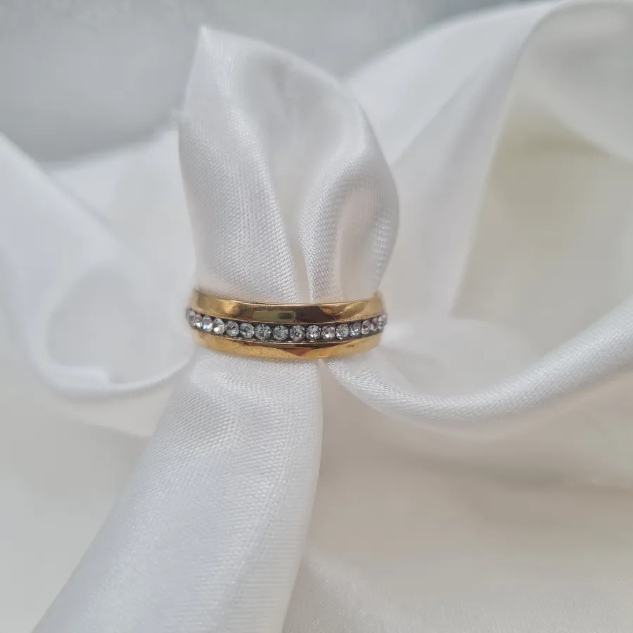 Το Golden Spark Line είναι η βέρα που συνδυάζει κλασικό χρυσό με λεπτή, “γραμμική” λάμψη. Μια συνεχή σειρά από λευκά κρυσταλλάκια τρέχει κατά μήκος του δαχτυλιδιού σαν μικρή φωτεινή ράγα, δίνοντας διακριτό glam χωρίς να κλέβει την παράσταση από τα υπόλοιπα κοσμήματά σου. Φοριέται τέλεια μόνο του σαν καθημερινή βέρα ή με άλλα λεπτά δαχτυλίδια για πιο statement αποτέλεσμα, είτε σε romantic είτε σε πιο minimal looks.