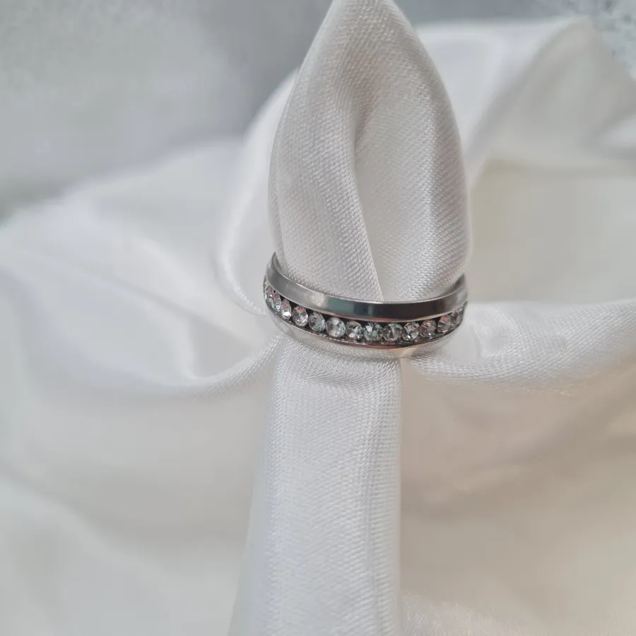 Το Silver Spark Line είναι η ψυχρή, minimal εκδοχή της λαμπερής βέρας. Η καθαρή ασημί γραμμή αγκαλιάζει μια μονή σειρά από διάφανα κρυσταλλάκια, δημιουργώντας ένα δαχτυλίδι που θυμίζει λεπτή riviera αλλά σε πιο καθημερινή, κομψή εκδοχή. Φοριέται μόνο του ως διακριτική βέρα ή στοιβάζεται με άλλα λεπτά δαχτυλίδια για πιο statement, μοντέρνο αποτέλεσμα.