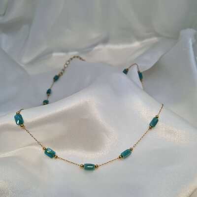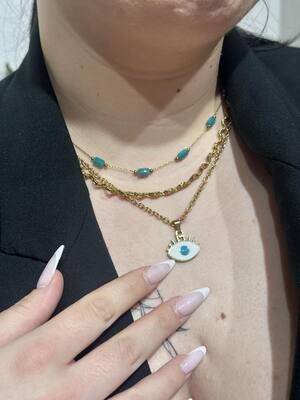 Λεπτεπίλεπτο κολιέ με χρυσή αλυσίδα και διακριτικές τιρκουάζ λεπτομέρειες που προσθέτουν μια φρέσκια και καλοκαιρινή πινελιά σε κάθε εμφάνιση. Ο minimal σχεδιασμός του το καθιστά ιδανικό για layering αλλά και για να φορεθεί μόνο του, χαρίζοντας κομψότητα όλη μέρα.