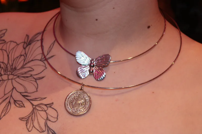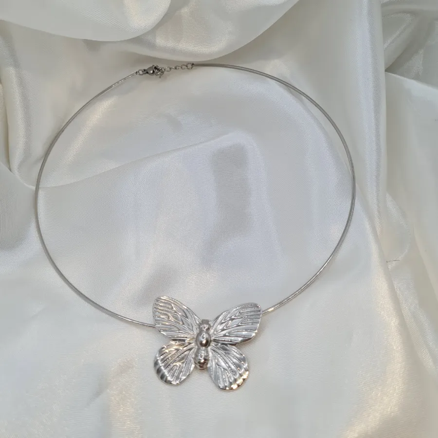 Minimal statement κολιέ με πεταλούδα σε λαμπερό ασημί φινίρισμα, ιδανικό για να σου δώσει ξεχωριστή λάμψη σε κάθε εμφάνιση. Η λεπτοδουλεμένη μεταλλική πεταλούδα “κάθεται” πάνω στον λεπτό, σταθερό κρίκο, δημιουργώντας έναν μοναδικό συνδυασμό διακριτικής φινέτσας και σύγχρονου urban glam.