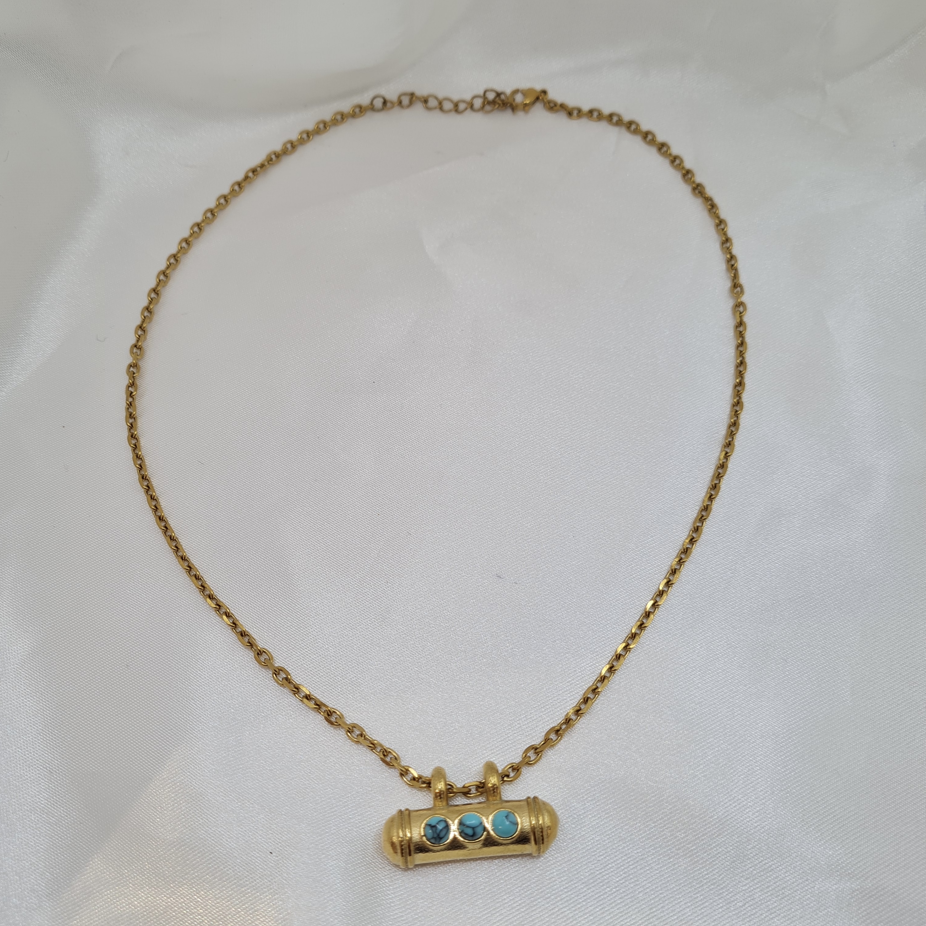Είσαι έτοιμη να προσθέσεις λίγη μαγεία στο στυλ σου; Το Blue Totem είναι εδώ για να σε ταξιδέψει! ✨ Ένα λαμπερό κολιέ με κυλινδρικό μενταγιόν σε ζεστό χρυσό τόνο, διακοσμημένο με τρεις γαλάζιες πέτρες που θυμίζουν ουρανό και θάλασσα 🌊💎☁️.