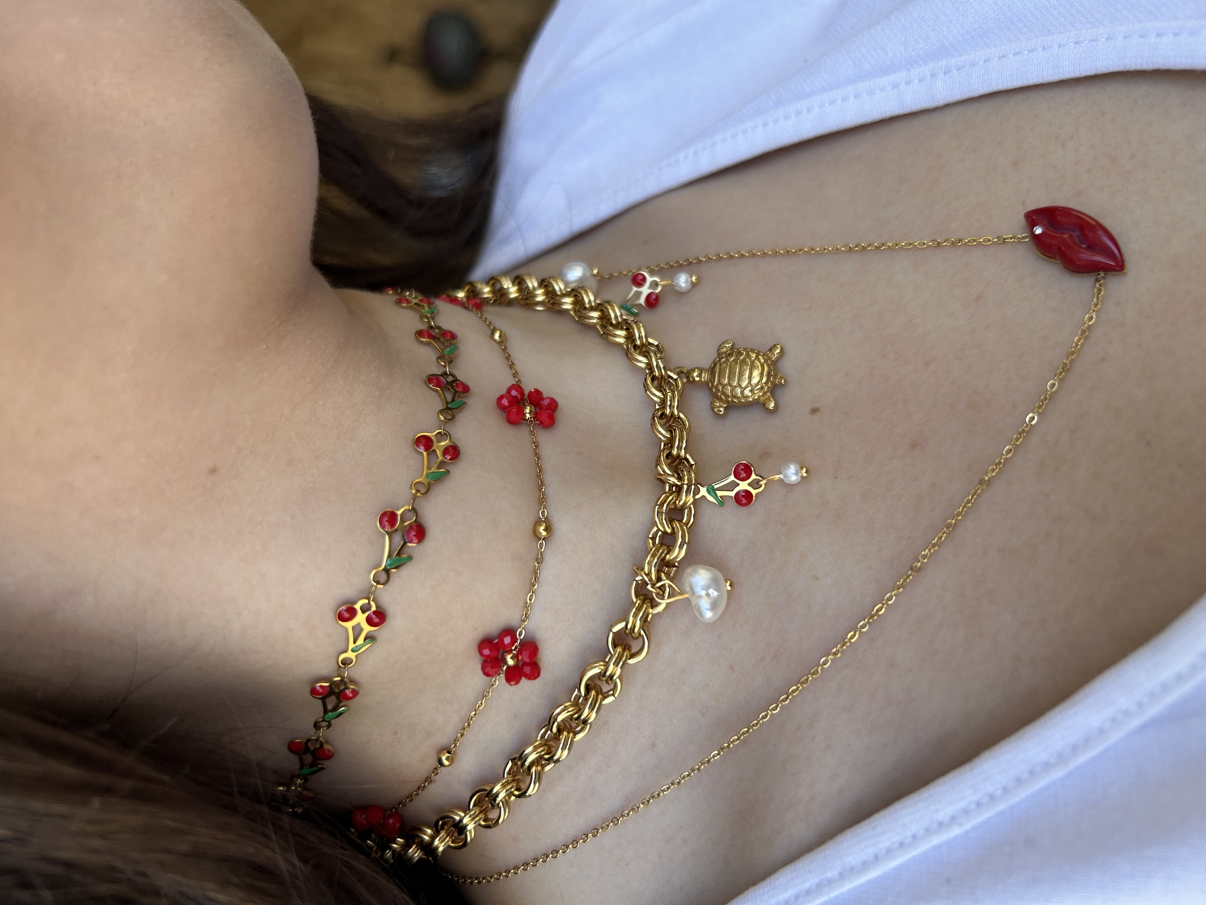 Αυτό το κολιέ είναι ό,τι πιο cute θα φορέσεις φέτος! Φτιαγμένο στο χέρι με λαχταριστά κερασάκια που μοιάζουν έτοιμα να τα δαγκώσεις (μην το κάνεις 😋), είναι το απόλυτο statement piece για κορίτσια που αγαπούν το χρώμα, τη χαρά και το στυλ με… γεύση καλοκαιριού!