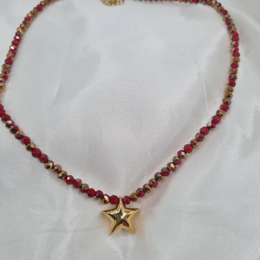 Ένα κολιέ που φωνάζει “holiday glam” με την πρώτη ματιά. Οι κόκκινες και χρυσές κρυστάλλινες χάντρες δημιουργούν γύρω από τον λαιμό μια φωτεινή, γιορτινή γραμμή, ενώ το χρυσό τρισδιάστατο αστεράκι στο κέντρο δίνει το απόλυτο festive touch χωρίς να γίνεται υπερβολικό.