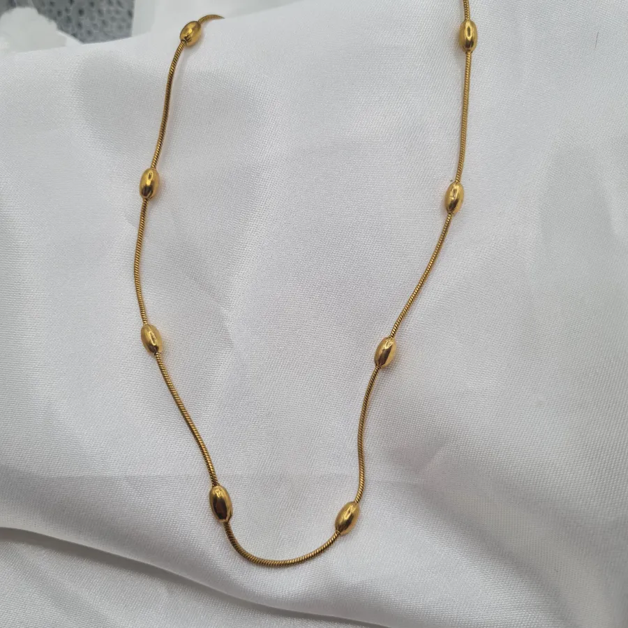 Λεπτό χρυσό κολιέ τύπου snake με μικρές, γυαλιστερές χάντρες διάσπαρτες κατά μήκος, σαν χρυσές “σταγόνες” που φωτίζουν διακριτικά τον λαιμό.