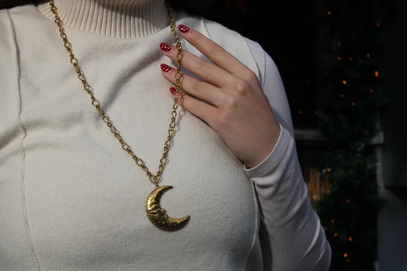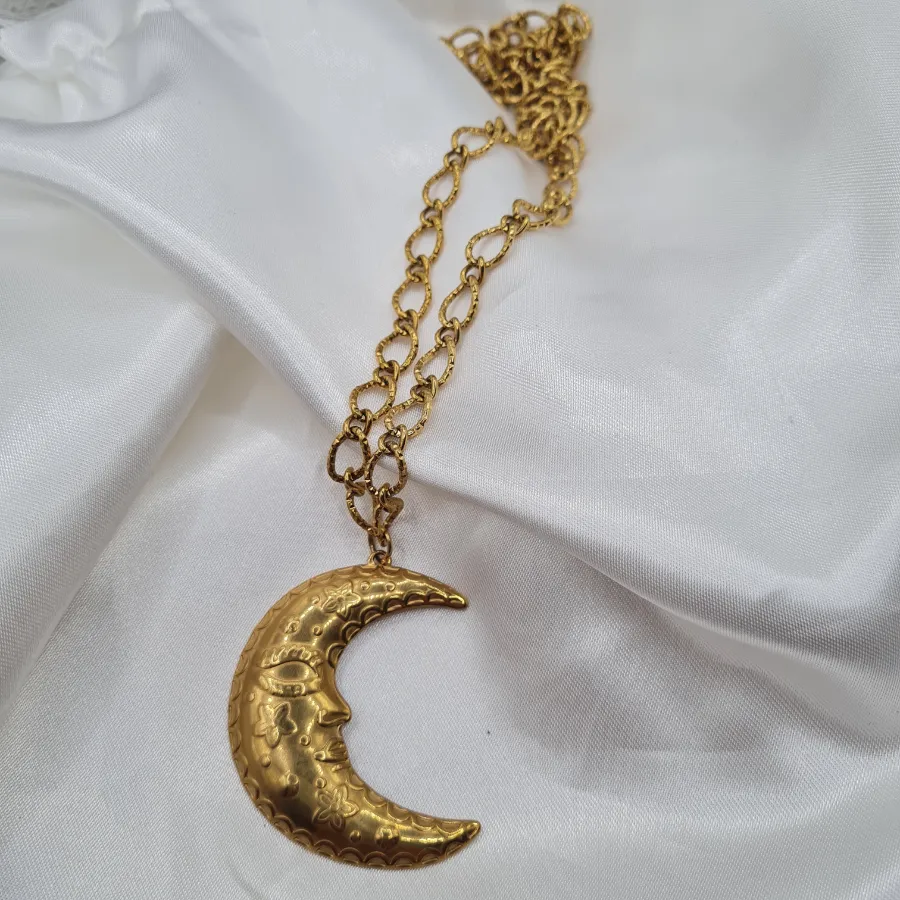 Ένα κολιέ που μοιάζει με μικρό, χρυσό φεγγάρι παραμυθιού να ξεκουράζεται πάνω στο στήθος σου. Το μισοφέγγαρο με το διακριτικό πρόσωπο και τα ανάγλυφα μοτίβα χαρίζει μυστηριακή, boho λάμψη.