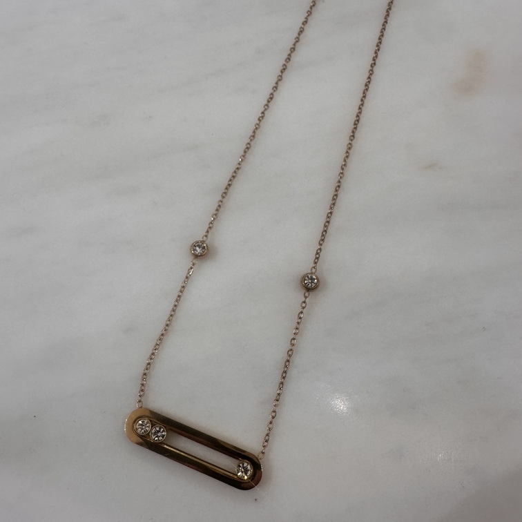 Κομψό κολιέ με λεπτή αλυσίδα και minimal οριζόντιο στοιχείο, διακοσμημένο με διακριτικές πέτρες ζιργκόν που χαρίζουν φίνα λάμψη. Ο μοντέρνος και καθαρός σχεδιασμός του το καθιστά ιδανικό για καθημερινή χρήση αλλά και για κομψές layered εμφανίσεις. Ένα διαχρονικό κόσμημα που συνδυάζει απλότητα και στυλ.