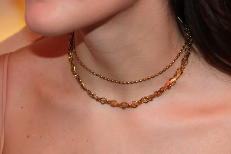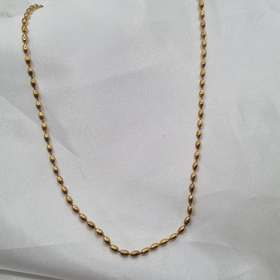 Λεπτό χρυσό κολιέ με μικρές, οβάλ “σιμιγδαλένιες” χάντρες σε όλο του το μήκος, που δίνει μια απαλή, διακριτική λάμψη γύρω από τον λαιμό.