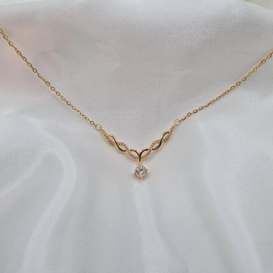 Ένα διακριτικό, V-shaped κολιέ που αγκαλιάζει κομψά το ντεκολτέ και δίνει την αίσθηση λεπτού, χρυσού “γλυπτού” πάνω στο δέρμα. Οι κυματιστές χρυσές λεπτομέρειες δένουν μεταξύ τους με μικρά κρυσταλλάκια και καταλήγουν σε μία κεντρική, λαμπερή πέτρα που θυμίζει μικρό δάκρυ φωτός.