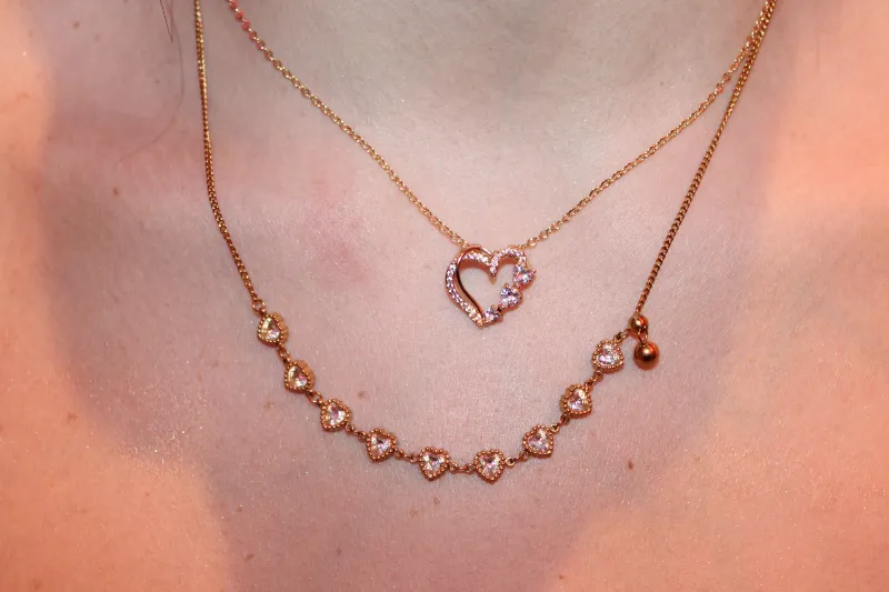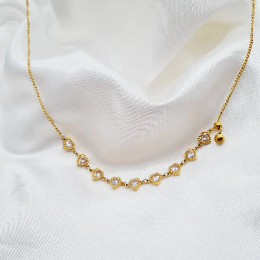 Ένα ρομαντικό, χρυσό κολιέ–γραμμή από μικρές καρδιές που ακουμπά απαλά στο ντεκολτέ και γεμίζει το βλέμμα λάμψη. Οι διάτρητες χρυσές καρδούλες, καθεμία στολισμένη με λευκό κρυσταλλάκι στο κέντρο, δημιουργούν ένα φωτεινό “χαμόγελο” γύρω από τον λαιμό, ενώ τα μικρά χρυσά charms στο πλάι προσθέτουν playful κίνηση σε κάθε βήμα.