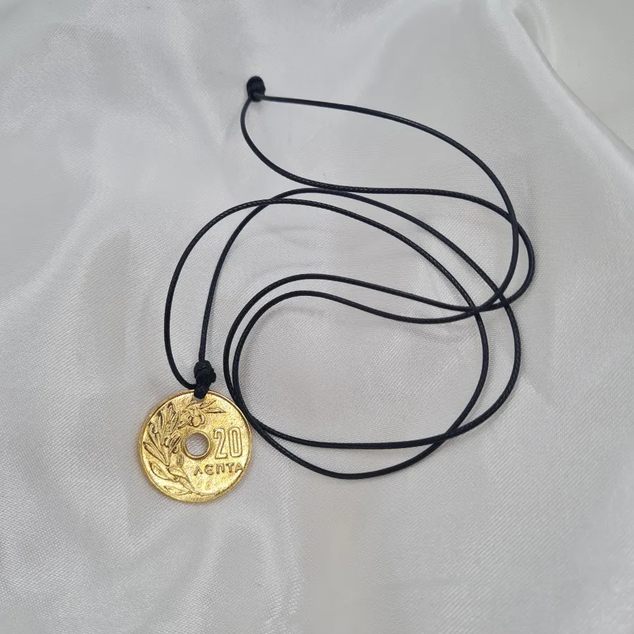 Ένα μοντέρνο κολιέ–γούρι με μαύρο κορδόνι και χρυσό μενταγιόν σε μορφή παλιάς ελληνικής δεκάρας, που δίνει έντονο vintage–lucky χαρακτήρα. Το κυκλικό “κέρμα” με την τρύπα στο κέντρο, τα ανάγλυφα φύλλα ελιάς και την ένδειξη «20 ΛΕΠΤΑ» παραπέμπει σε κλασικό φυλαχτό για αφθονία και οικονομική τύχη, ενώ φοριέται άνετα σε κάθε στιλ, από casual μέχρι πιο rock.