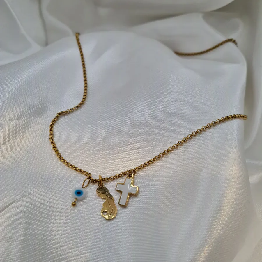 Ένα τρυφερό χρυσό κολιέ αφιερωμένο στη μαμά και στη δύναμη της μητρότητας, με τρία συμβολικά στοιχεία: λευκό σταυρουδάκι, ματάκι για προστασία και charm εγκύου που αγκαλιάζει τη φουσκωμένη κοιλίτσα της. Κάθε κίνηση της αλυσίδας γεμίζει με μικρές λάμψεις, δημιουργώντας ένα κομψό, συναισθηματικό κόσμημα που “γράφει” όμορφα τόσο σε καθημερινές εμφανίσεις όσο και σε πιο ιδιαίτερες στιγμές.