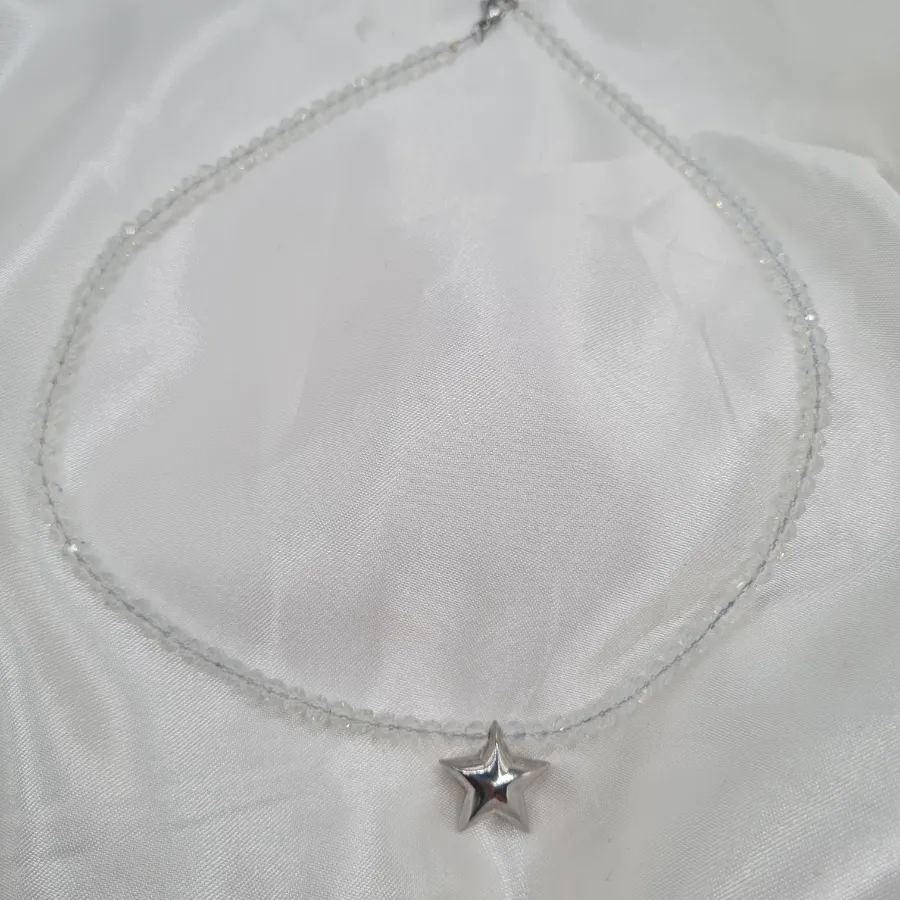 Ένα κολιέ σαν μικρή δόση… σεληνόφωτου. Οι διάφανες, κρυστάλλινες χάντρες αγκαλιάζουν τον λαιμό σαν λεπτή γραμμή από φως, ενώ στο κέντρο το ασημί τρισδιάστατο αστέρι δίνει clean, modern glam αποτέλεσμα που ταιριάζει με όλα.