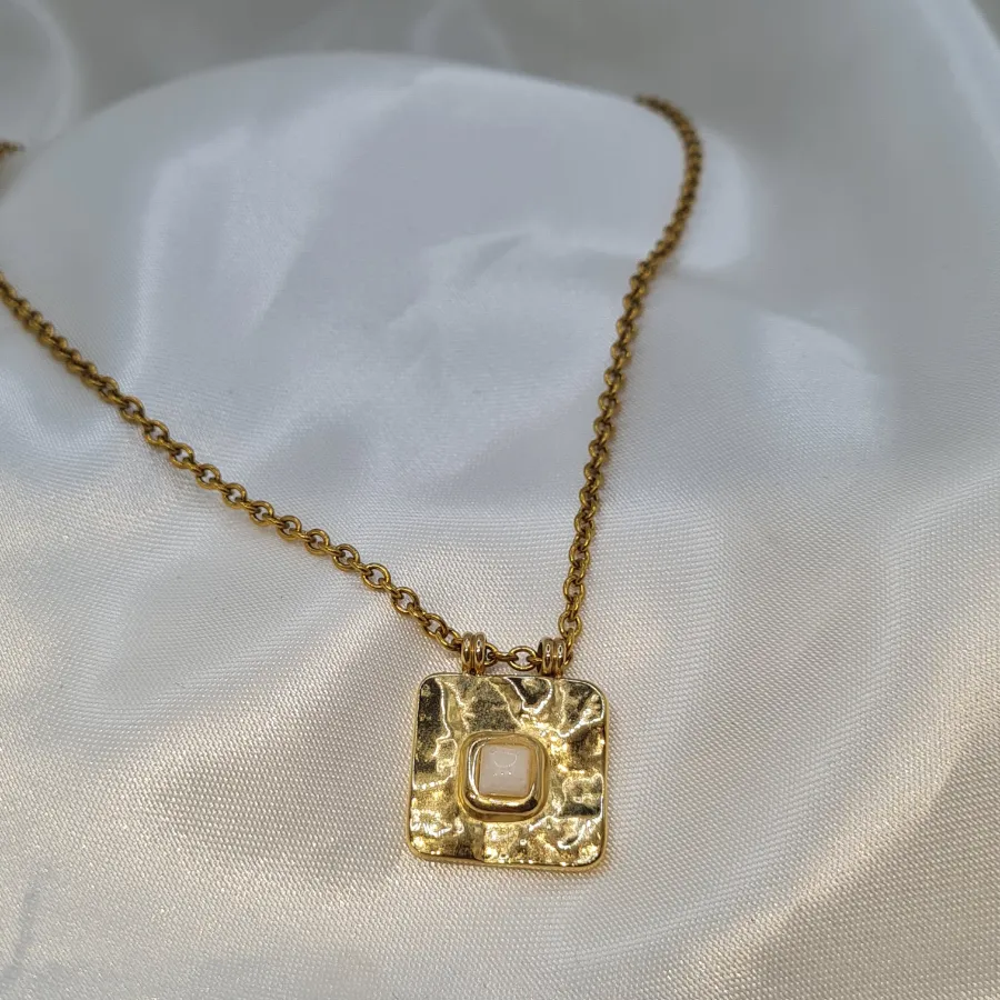 Αν θες να κλέψεις την παράσταση από το πρώτο λεπτό, αυτό το κολιέ είναι το απόλυτο “hero piece”! Το ιδιαίτερο τετραγωνισμένο μεταλλικό μενταγιόν, με hammered υφή και διακριτική mother of pearl λεπτομέρεια στο κέντρο, δίνει έναν αέρα πολυτέλειας αλλά και μοντέρνας θηλυκότητας.