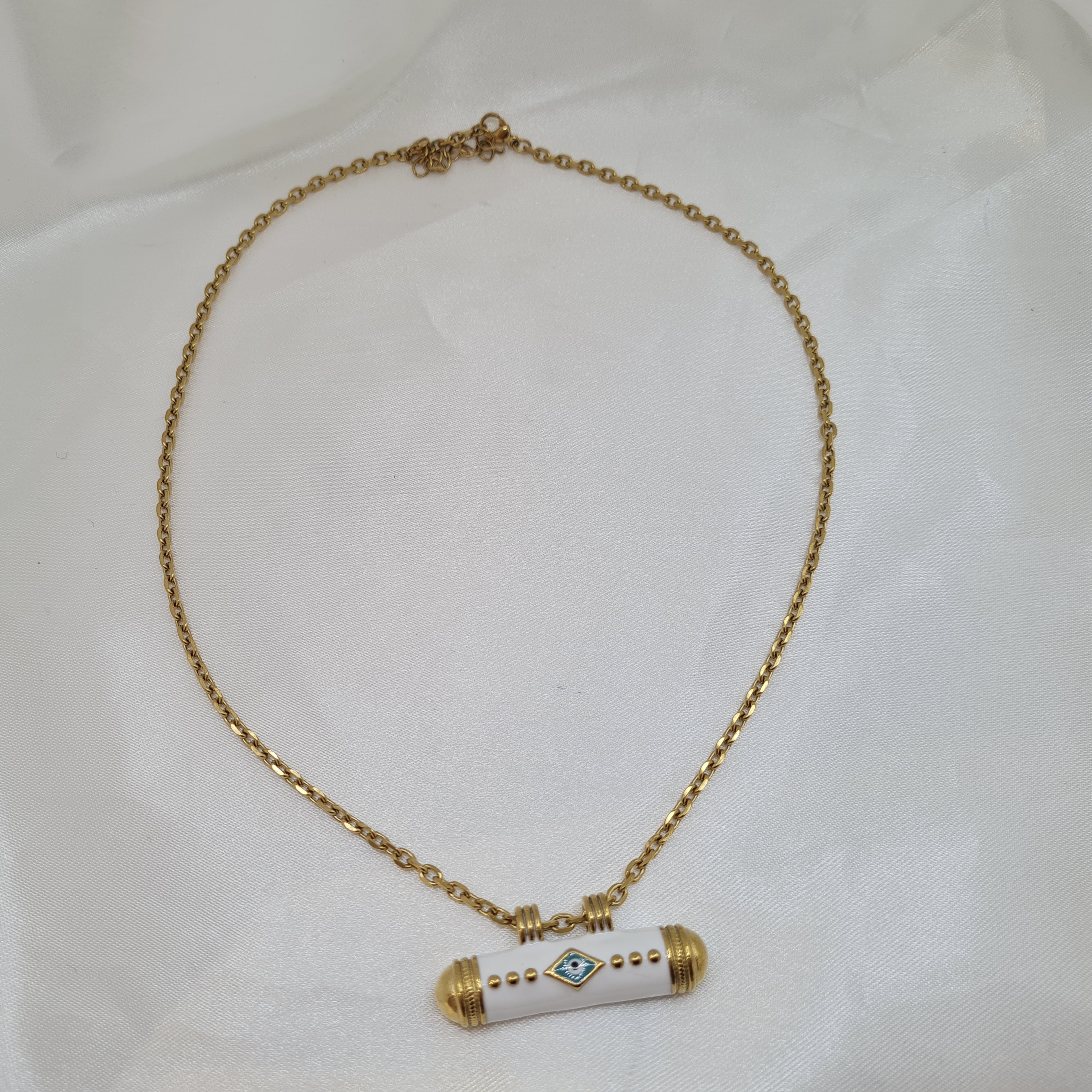 Φέρε λίγη μαγεία στο στυλ σου με το Pokahontas – ένα κομψό αλλά παιχνιδιάρικο κολιέ που μοιάζει να βγήκε από ένα boho παραμύθι! ✨ Το λευκό κυλινδρικό μενταγιόν, με τις χρυσές λεπτομέρειες και το μικρό μπλε διαμαντάκι στο κέντρο 💎, τραβάει όλα τα βλέμματα και προσθέτει μια γλυκιά, μυστηριώδη νότα σε κάθε σου εμφάνιση.