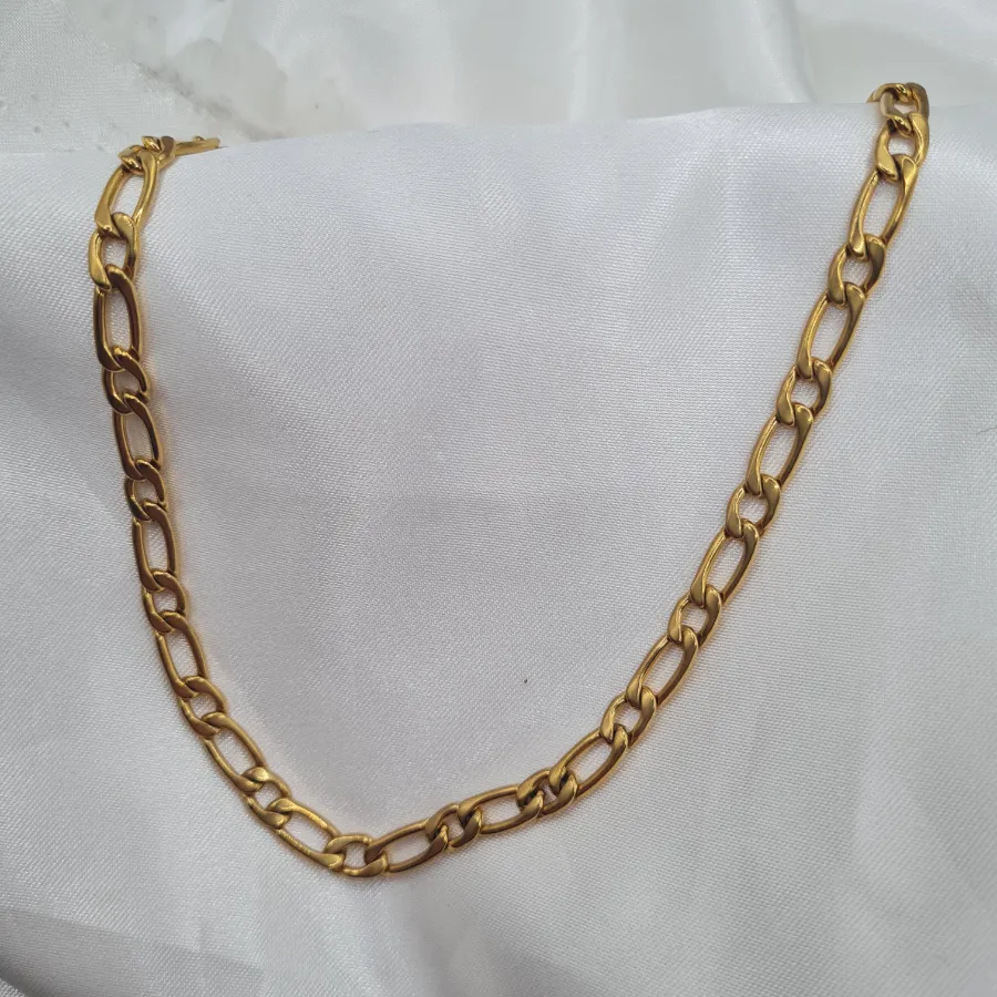 Χρυσό κολιέ με πιο έντονους, flat κρίκους τύπου chain που δίνουν δυναμικό αλλά πάντα κλασικό χαρακτήρα σε κάθε look.