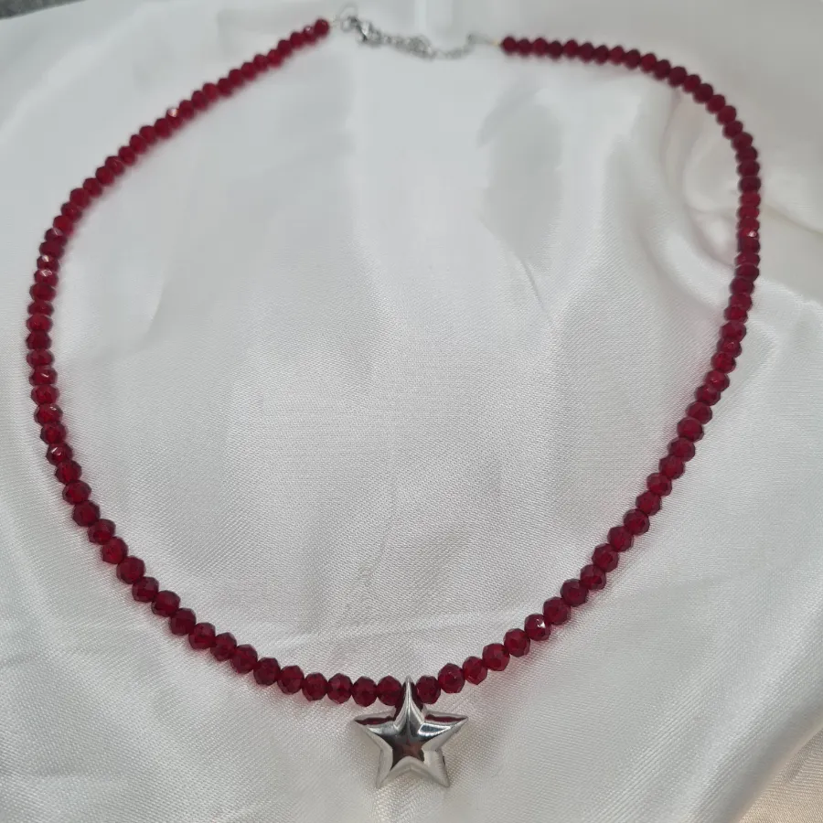 Κολιέ που γράφει “είμαι εδώ για να ξεχωρίζω”. Οι βαθιές κόκκινες, χαντρούλες δένουν γύρω από τον λαιμό σαν λεπτή γραμμή από ρουμπίνια, ενώ στο κέντρο το ασημί τρισδιάστατο αστέρι δίνει καθαρό, urban glam χαρακτήρα – λίγο rock, λίγο festive, 100% eye–catching.