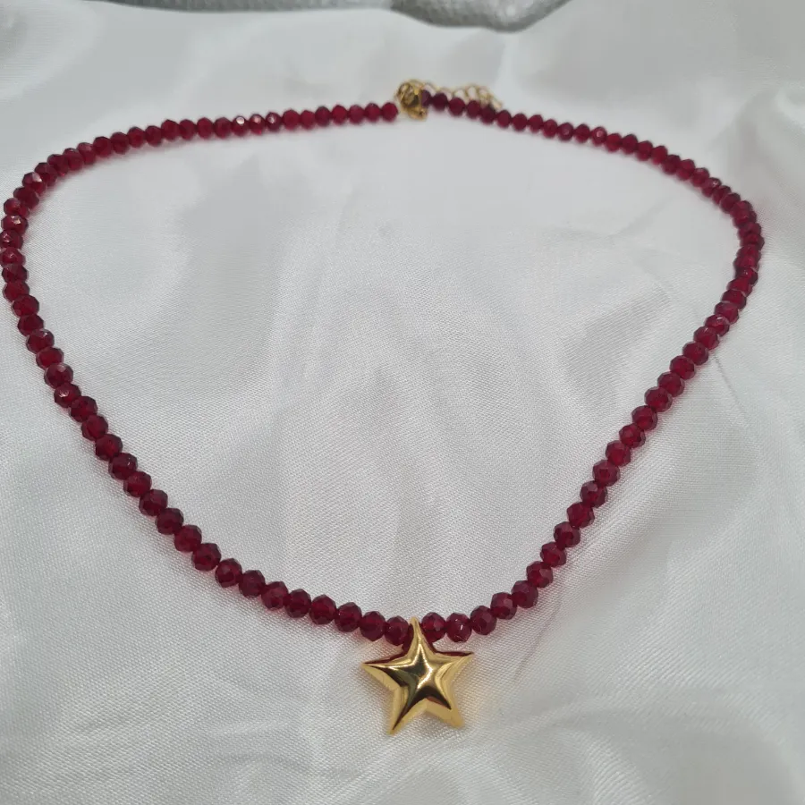 Ένα κόκκινο κολιέ–μαγνήτης για τα βλέμματα. Οι βαθιές, ρουμπινί κρυστάλλινες χάντρες δημιουργούν γύρω από τον λαιμό μια έντονη, ζεστή γραμμή χρώματος, ενώ το χρυσό τρισδιάστατο αστεράκι στο κέντρο δίνει το απόλυτο bold, glam touch.