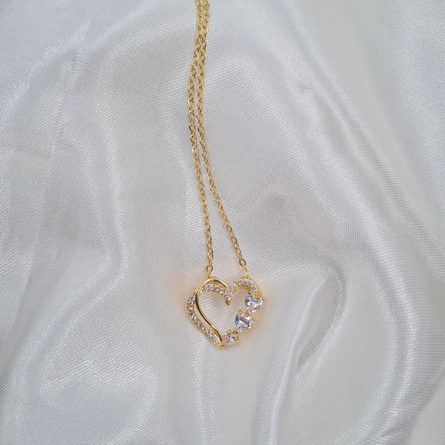 Ένα ρομαντικό, λαμπερό κολιέ–καρδιά που μοιάζει με μικρή ιστορία αγάπης φορεμένη στο λαιμό. Η χρυσή καρδιά αγκαλιάζει διαγώνια τρία έντονα, λευκά κρυσταλλάκια που θυμίζουν μικρές σταγόνες φωτός και δίνουν στο κόσμημα κίνηση και extra sparkle χωρίς να το βαραίνουν.