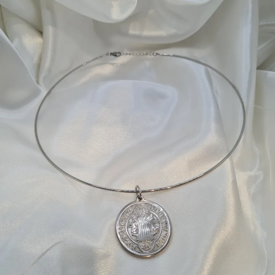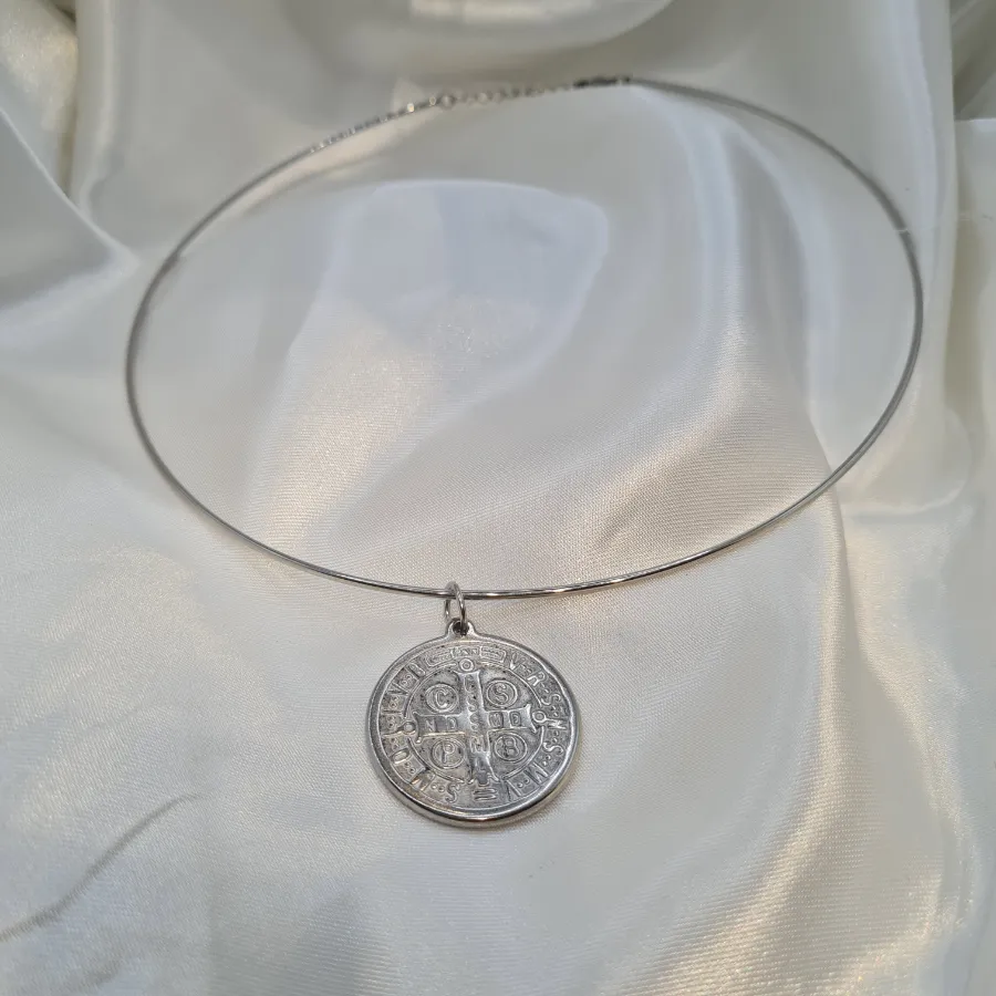 Minimal κολιέ με διπλής όψης μενταγιόν που αποπνέει διαχρονικότητα και σύγχρονη πολυτέλεια. Ο λεπτός, σταθερός ασημί κρίκος “αγκαλιάζει” τον λαιμό, προσφέροντας εκλεπτυσμένο αποτέλεσμα, ενώ το στρογγυλό μενταγιόν με γραφική λεπτομέρεια και στις δύο πλευρές προσθέτει αυθεντικότητα και vintage πινελιά σε κάθε εμφάνιση.