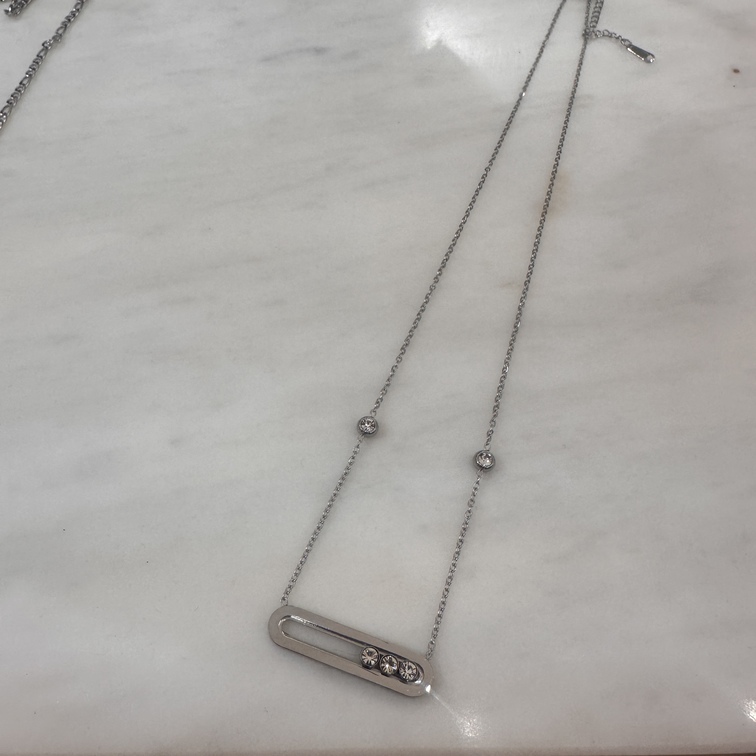 Κομψό κολιέ με λεπτή αλυσίδα και minimal οριζόντιο στοιχείο, διακοσμημένο με διακριτικές πέτρες ζιργκόν που χαρίζουν φίνα λάμψη. Ο μοντέρνος και καθαρός σχεδιασμός του το καθιστά ιδανικό για καθημερινή χρήση αλλά και για κομψές layered εμφανίσεις. Ένα διαχρονικό κόσμημα που συνδυάζει απλότητα και στυλ.
