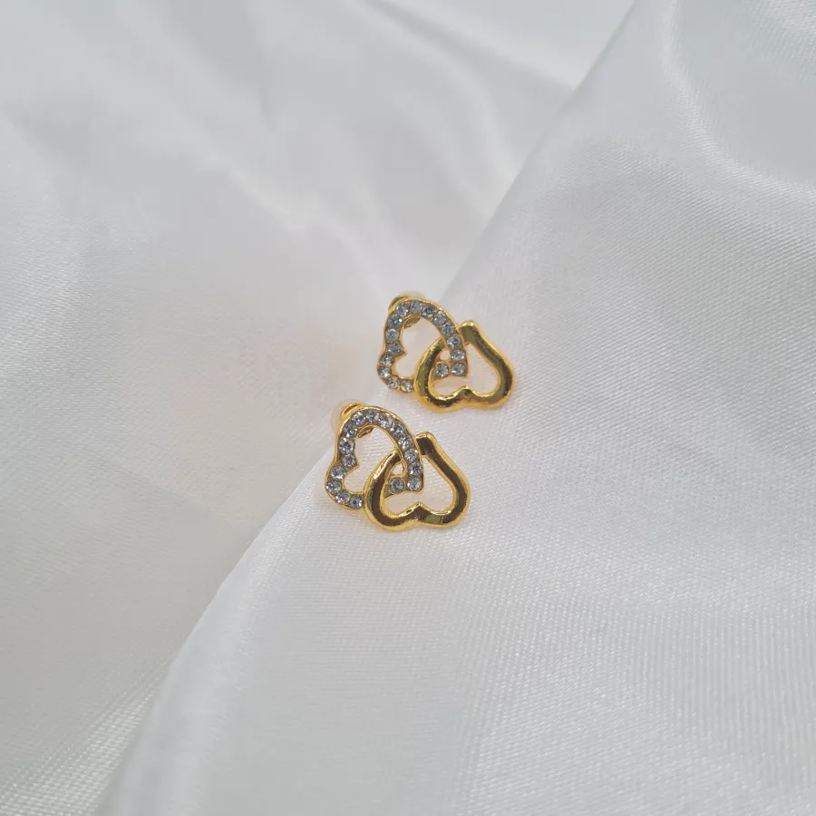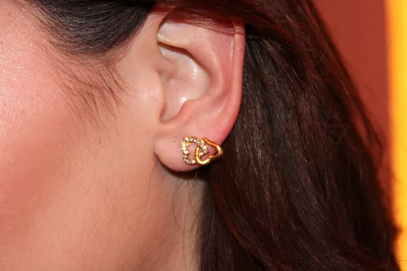 Τα Linked Hearts είναι μικρά αλλά ουσιαστικά σκουλαρίκια, φτιαγμένα για όσους αγαπούν τις ρομαντικές λεπτομέρειες χωρίς υπερβολές. Δύο χρυσές καρδιές μπλέκονται μεταξύ τους, με τη μία στολισμένη με λαμπερά λευκά κρυσταλλάκια και την άλλη σε λείο, γυαλιστερό φινίρισμα, δημιουργώντας ένα κομψό παιχνίδι φωτός πάνω στο αυτί.