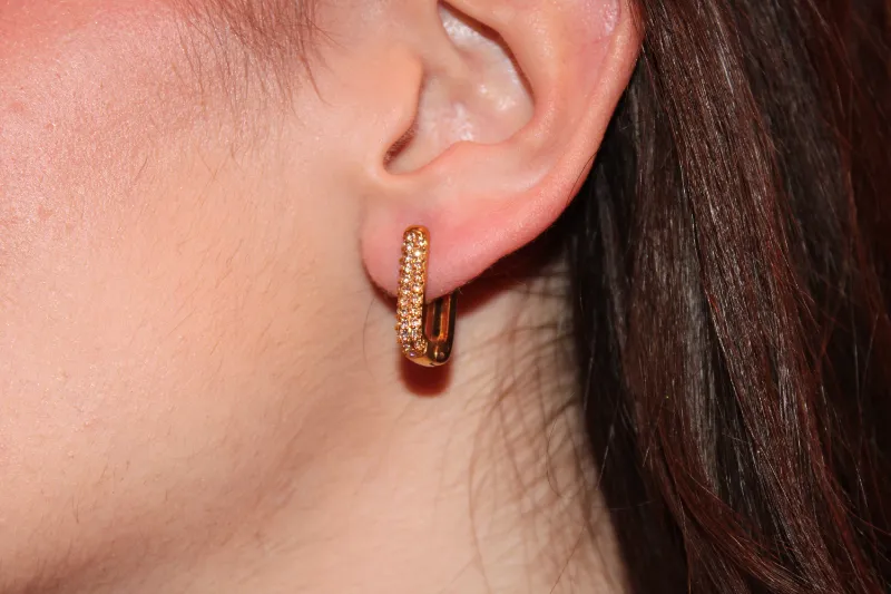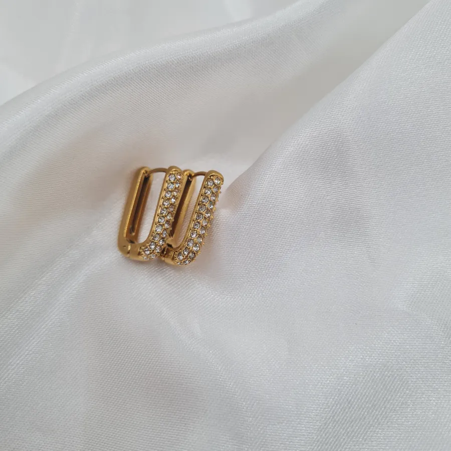 Τα Shiny Bar Hoops είναι χρυσοί, επιμήκεις κρίκοι που δίνουν καθαρή, σύγχρονη λάμψη στο αυτί. Η μπροστινή τους επιφάνεια είναι καλυμμένη με σειρές από μικρά λευκά κρυσταλλάκια, δημιουργώντας μια κομψή “μπάρα” φωτός που ταιριάζει ιδανικά τόσο σε minimal όσο και σε πιο glam σύνολα.