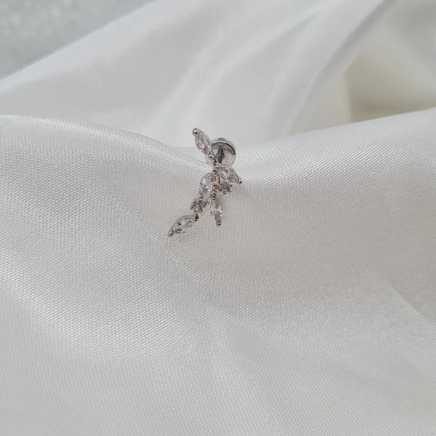 Το Silver Crystal Vine είναι η πιο δροσερή, λαμπερή εκδοχή του κλασικού “κλαδάκι” σκουλαρικιού. Οι διάφανες πέτρες σε σχήμα φύλλων δημιουργούν μια λεπτή ασημί γραμμή που ακολουθεί το αυτί, σαν μικρός φωτισμένος βλαστός που “τρέχει” κατά μήκος του λοβού.