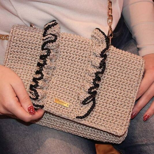 Κομψή και ιδιαίτερη χειροποίητη πλεκτή τσάντα, σχεδιασμένη για να δίνει στυλ σε κάθε εμφάνιση. Διαθέτει μεταλλική αλυσίδα ώμου και διακριτικές διακοσμητικές λεπτομέρειες τύπου βολάν, που προσθέτουν χαρακτήρα και θηλυκότητα στο σχέδιο.