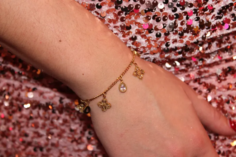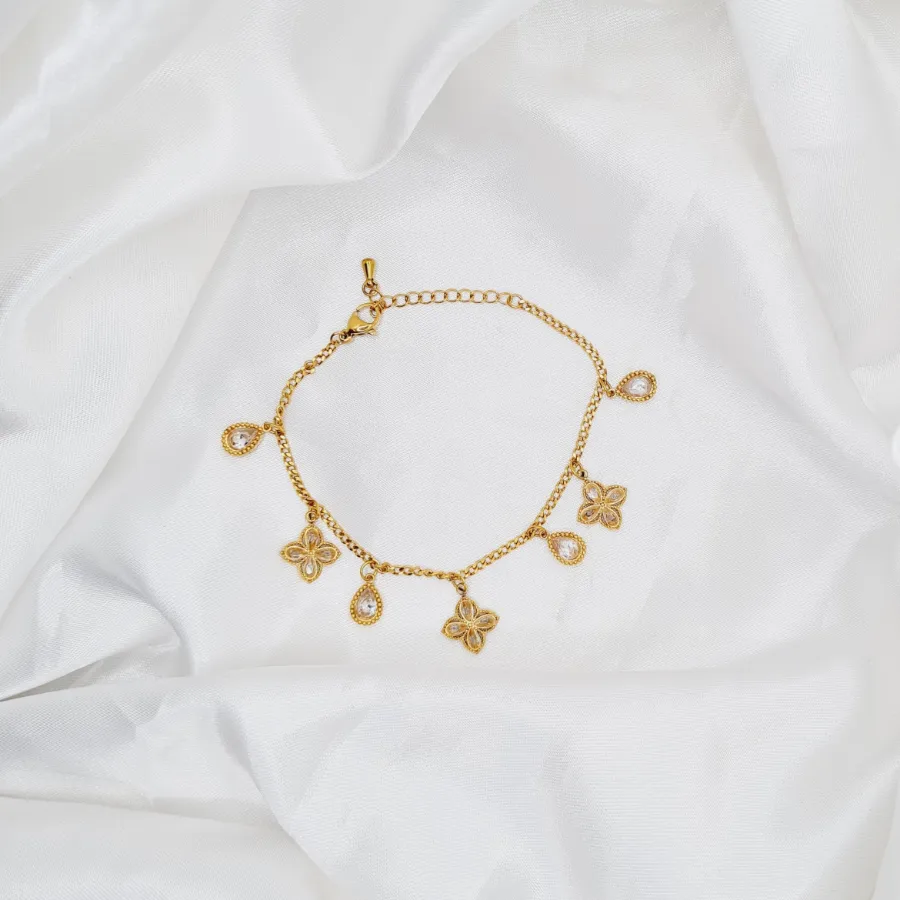 Το Bloom & Drops είναι το βραχιόλι που φέρνει μια δόση “γλυκιάς τύχης” σε κάθε σου εμφάνιση. Η λεπτή χρυσή αλυσίδα στολίζεται με κρεμαστά μοτίφ: μικρά τετράφυλλα λουλούδια και σταγόνες διακοσμημένες με λαμπερά κρυσταλλάκια, που κινούνται απαλά και φωτίζουν τον καρπό σε κάθε σου βήμα.