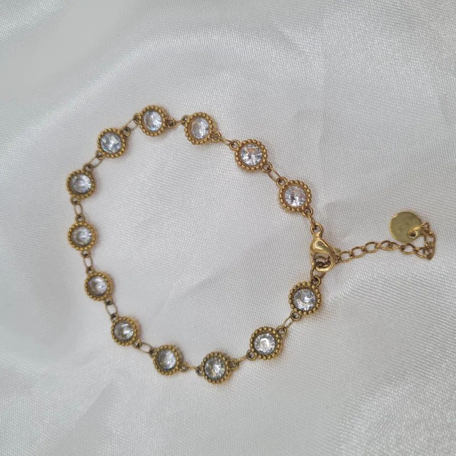 Το Crystal Dots είναι το βραχιόλι που φέρνει μαζί ρετρό γοητεία και διακριτική λάμψη. Μια σειρά από στρογγυλές, διάφανες πέτρες αγκαλιάζονται από χρυσή, λεπτοδουλεμένη μπορντούρα, δημιουργώντας ένα συνεχόμενο μοτίβο που θυμίζει κλασικά κοσμήματα άλλης εποχής – αλλά με φρέσκια, καθημερινή αισθητική. Φοριέται μόνο του για ένα θηλυκό αποτέλεσμα ή σε συνδυασμό με άλλα λεπτά βραχιόλια για πιο πλούσιο layering.