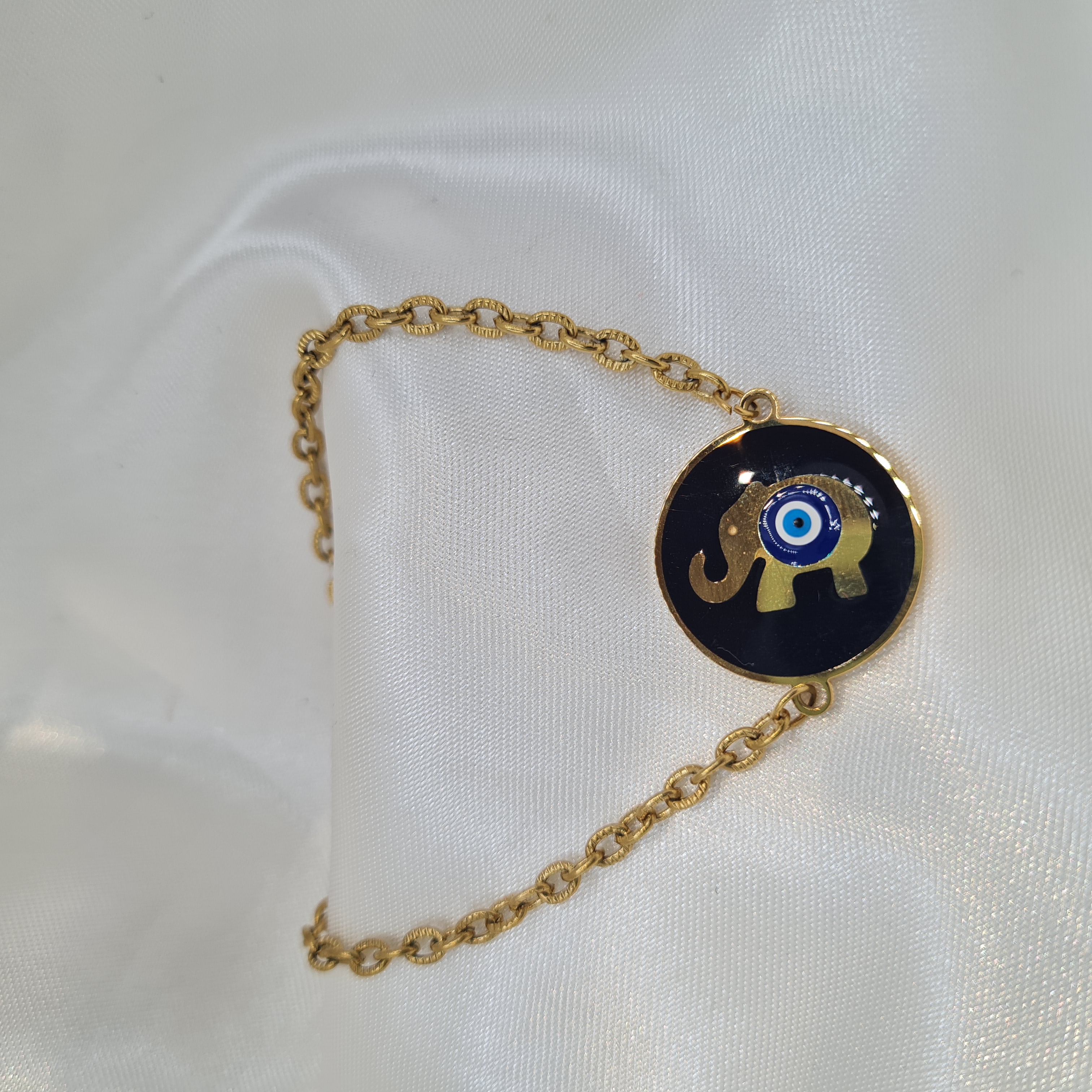 Το Golden Lucky Elephant είναι ένα βραχιόλι γεμάτο συμβολισμό και θετική ενέργεια. Στο κέντρο του δεσπόζει ένα στρογγυλό μαύρο μενταγιόν με χρυσό ελεφαντάκι — σύμβολο τύχης, σταθερότητας και καλής ζωής. Δίπλα του, το κλασικό μπλε μάτι προσφέρει προστασία από την αρνητικότητα, συνδυάζοντας παράδοση και μοντέρνα αισθητική.
