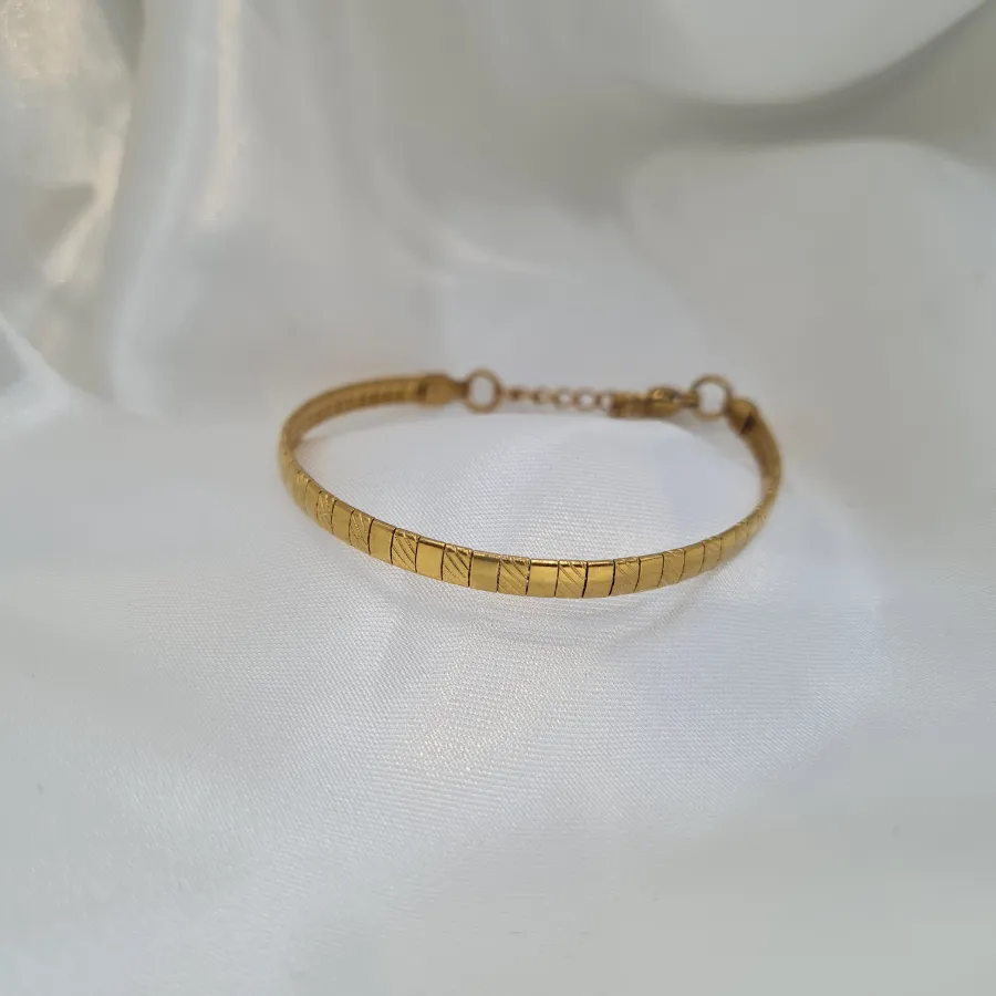 Το Linear Glow είναι ένα χρυσό βραχιόλι που ξεχωρίζει με το διακριτικό, ρυθμικό μοτίβο στην επιφάνειά του, σαν μικρές σκαλιστές “γραμμές” που παίζουν με το φως σε κάθε κίνηση του χεριού. Το λεπτό αλλά σταθερό του σχήμα το κάνει κομμάτι που «γράφει» κομψά στον καρπό, προσθέτοντας μια ζεστή, χρυσή λάμψη χωρίς να δείχνει υπερβολικό.