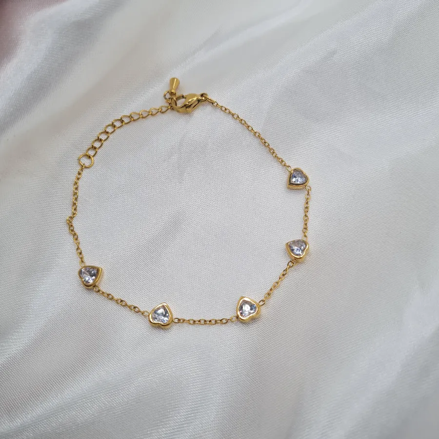Το Little Hearts είναι το βραχιόλι που δίνει τη πιο γλυκιά, διακριτική λάμψη στον καρπό σου. Μια λεπτή χρυσή αλυσίδα στολίζεται με μικρές καρδιές, καθεμιά με λευκή πέτρα στο κέντρο, δημιουργώντας ένα απαλό “μονοπάτι” φωτός που κινείται μαζί σου χωρίς να βαραίνει το χέρι.