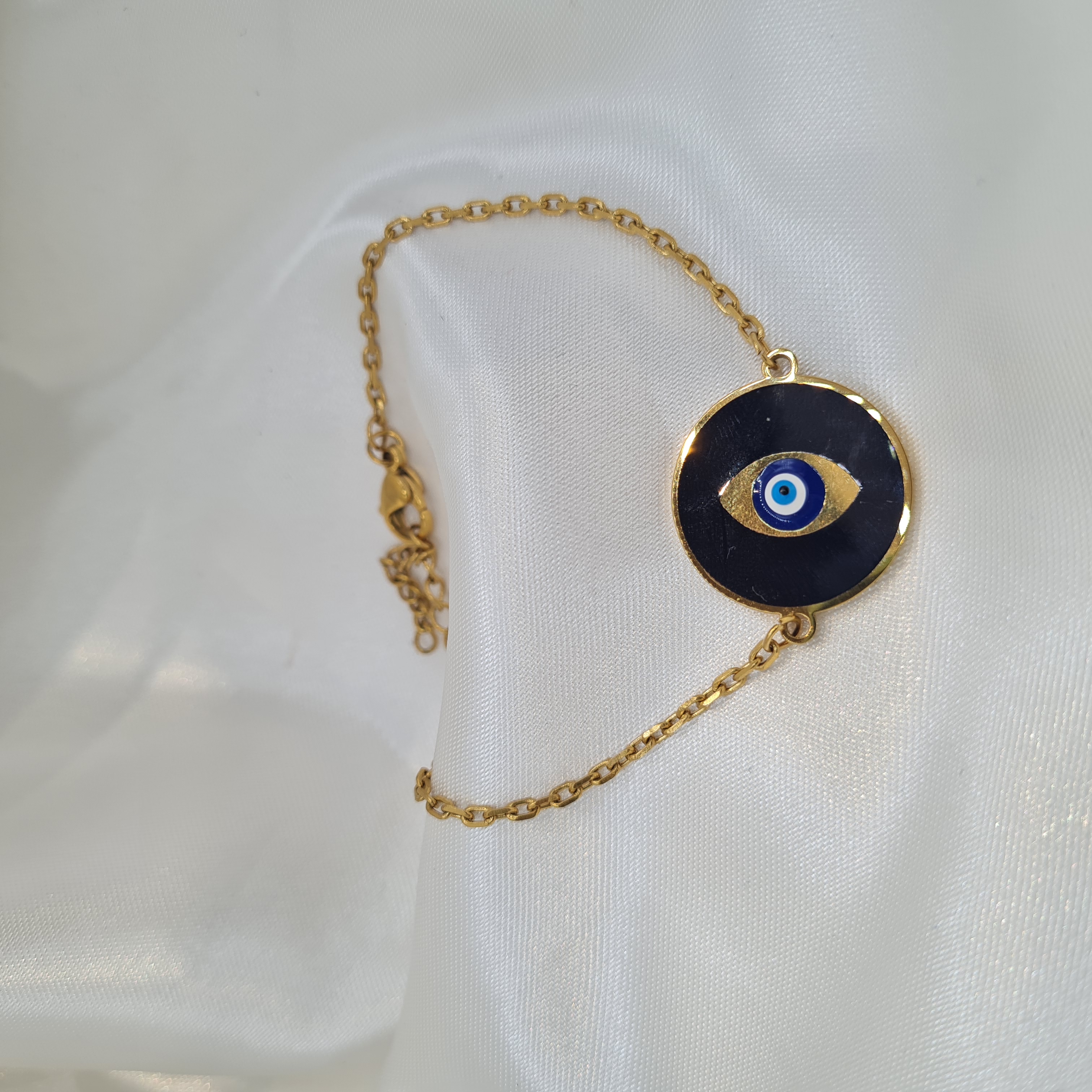 Το Mystic Shield είναι ένα βραχιόλι που συνδυάζει μυστικισμό, κομψότητα και καθημερινή προστασία. Στο κέντρο του ξεχωρίζει ένα στρογγυλό μαύρο μενταγιόν με χρυσή λεπτομέρεια σε σχήμα ματιού, ενώ το κλασικό μπλε μάτι στο εσωτερικό του απογειώνει το σύμβολο, προσφέροντας μια elegant αλλά και συμβολική πινελιά.