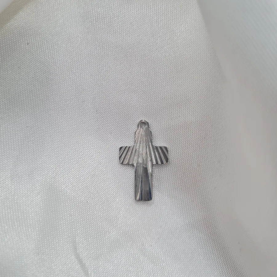 Ασημί σταυρός με γεωμετρικές χαράξεις που θυμίζουν ακτίνες φωτός, για κοσμήματα με διακριτική λάμψη και πνευματικό συμβολισμό.